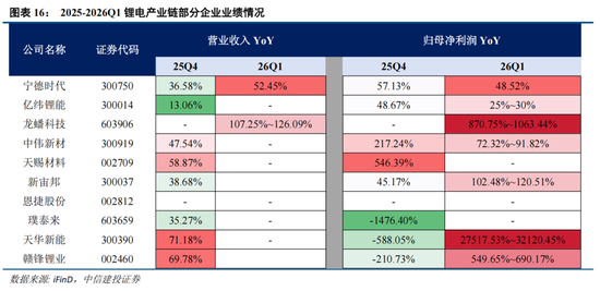 锂电产业链一季报业绩高增的确定性正在被密集验证。电芯龙头26Q1实现营收1291亿元、同比增长52.45%,归母净利润207亿元、同比增长48.52%,营收增速已逐季攀升至五个季度以来的最高水平,利润端同样维持在近五个季度的高位区间,反映下游动力与储能需求的共振拉动效应仍在加速兑现。26Q1归母净利润预增25%-35%,储能电芯满产满销的状态进一步印证了需求端的饱满程度。更值得关注的是,此前深陷亏损的中上游环节正在集中迎来盈利拐点。锂盐端,、26Q1同比大幅扭亏;正极材料端,26Q1预计净利润2亿-2.5亿元,磷酸铁锂加工费上调叠加碳酸锂涨价带来的库存收益是核心驱动;26Q1归母净利润预增72%-92%,三元与铁锂双线需求的同步回暖支撑了业绩释放。产业链利润分配格局正从“电芯独强”向各环节均衡修复演进,这一信号意味着行业景气度的传导已从下游渗透至中上游。