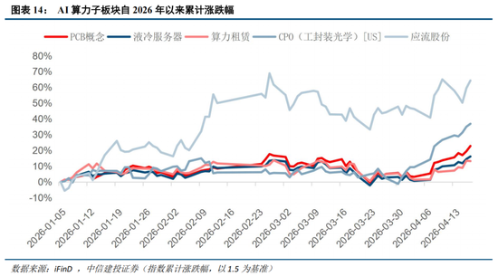 算力仍是一季报景气主线,且正由核心硬件向“算力+”基础设施环节扩散。一季度营业收入66.74亿元,营收同比录得37.82%,归母净利润录得15.83亿元,同比增长56.83%;一季度营业收入40.34亿元,营收同比录得68.06%,归母净利润录得6.87亿元,同比增长35.82%。同时,公开披露显示国产算力芯片、PCB等半导体产业链延续了2025年以来的高景气,而随着数据中心容量和功率密度持续上行,液冷、算力租赁和供电等“算力+”方向仍是后续景气扩散中值得继续重点跟踪的环节。