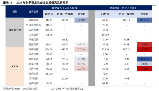 创新药板块的景气度从业绩端与交易端获得双重确认,龙头企业业绩大幅超预期。2025年年报显示,头部创新药企利润兑现能力普遍超出市场预期,全年营收382亿元、同比增长40.5%,营业利润26亿元较市场一致预期高出43.3%,核心品种的全球放量节奏明显快于此前假设;营收455亿元、同比增长15.8%,营业利润239亿元超预期21.2%,在地缘政治扰动反复的背景下仍实现了利润端的大幅超额兑现。与此同时,多家企业实现营业利润的高速增长,尽管部分公司缺乏可比的一致预期数据,但利润增速本身已指向行业盈利能力的系统性修复。