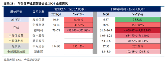 这一轮景气的强度已在A股半导体公司一季报中得到系统性验证。存储环节弹性最为突出,26Q1归母净利润29亿元、同比增长1568%,预计净利润31.5亿-36.5亿元、同比扭亏为盈,核心受益于DRAM与NAND Flash合约价的大幅上涨。光模块领域,中际旭创26Q1净利润57亿元、同比增长262%,算力资本开支的持续扩张为其提供了高确定性的收入支撑。芯片设计端,海光信息预计26Q1营收39亿-42亿元、同比增长63%-76%,国产高端处理器的市场空间仍在打开。设备与材料环节,净利润同比增长655%-762%,增长70%-84%,国产替代进程的推进为相关公司带来了持续的订单与利润增量。