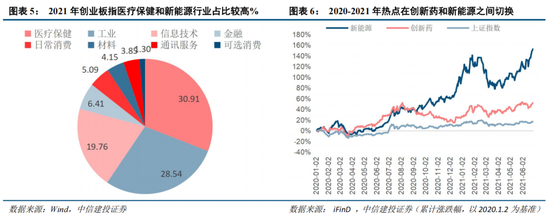 2)2020-2021年创业板指的医疗保健和新能源行业占比较高。疫情驱动医药生物板块持续上涨,尤其是医疗器械和疫苗板块,而2021年全国两会“双碳”被首次写入政府工作报告,碳中和成为当年热点题材,上述因素共同推动创业板指上涨至历史中高分位3600点。