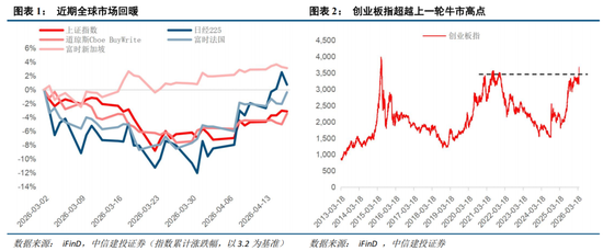 近期,美伊谈判提上日程,全球市场反攻启动。目前A股核心进攻方向集中在创业板,本周创业板指跨越上一轮牛市高点,但是投资者对于创业板是否仍然有较大上涨空间产生了分歧。综合创业板指权重股算力和新能源的上涨潜力、估值仍处于低位等情况来看,我们认为当下创业板指仍然是A股中最有性价比的方向。产业布局方面,建议对一季度高业绩板块进行挖掘,可关注板块有:新能源、储能、锂电材料、AI算力、创新药、半导体、消费等。