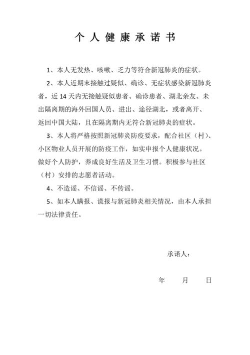 不少承诺书当中存在有针对居家观察的条款,像“从某年某月某日起始,我于某地之内进行居家观察,这段时间未曾前往区外”这样的表述。此处的时间、地点均是关键要点,务必精准无误。如实上报自身的行动轨迹,是判定风险等级、拟定防控策略的根基。