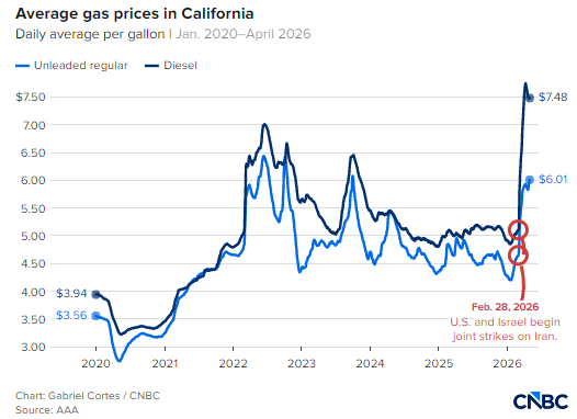 与此同时,加州周四柴油均价约为每加仑 7.50 美元,自 2 月 28 日战事爆发以来涨幅达 47%。