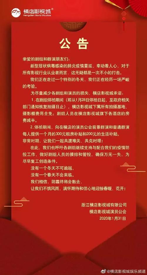 2020年1月27日时,横店影视城发布了紧急通知,所有正在拍摄以及筹备的剧组全部停工了,那时横店存在《有翡》《传家》等三十多个剧组,涉及的演职人员超过了6000人,原本热热闹闹的拍摄基地瞬间变得冷清下来,很多演员以及群演都措手不及,1月31日,中广联正式下发通知,要求全国影视剧拍摄全面暂停,直至国家防疫部门宣布解除防控。